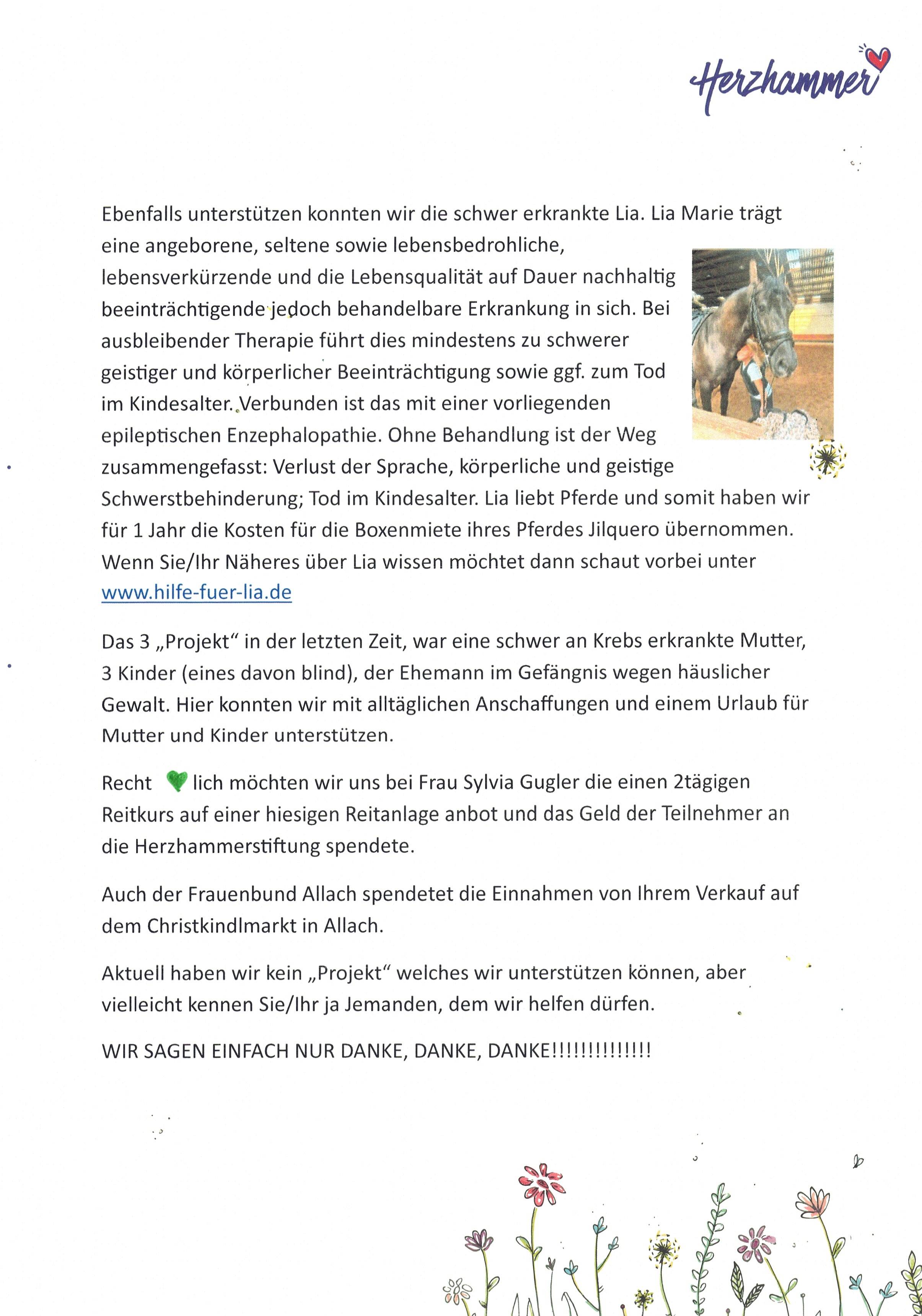 Recht herzlich möchten wir uns bei Frau Sylvia Gugler die einen 2tägigen Reitkurs auf einer hiesigen Reitanlage anbot und das Geld der Teilnehmer an die Herzhammerstiftung spendete.
